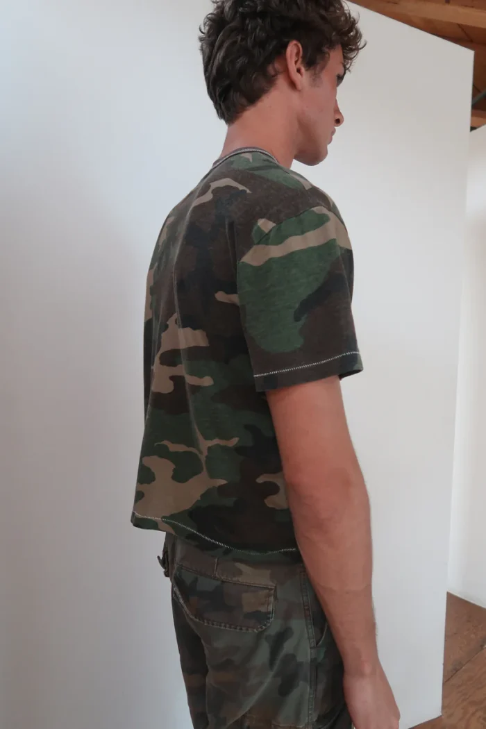 Crafted from soft cotton jersey with an authentically roll-printed camo pattern. Features contrast topstitching, and ERL’s signature classic fit. Finished with irregular triple needle stitching at the collar and single-stitch hems for a true vintage feel.